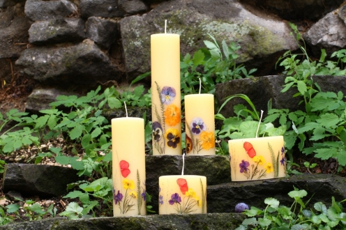 Mézes akác illatúak a sárga vadvirágos gyertyák. Árvácskás díszítést idén nem tudunk készíteni.